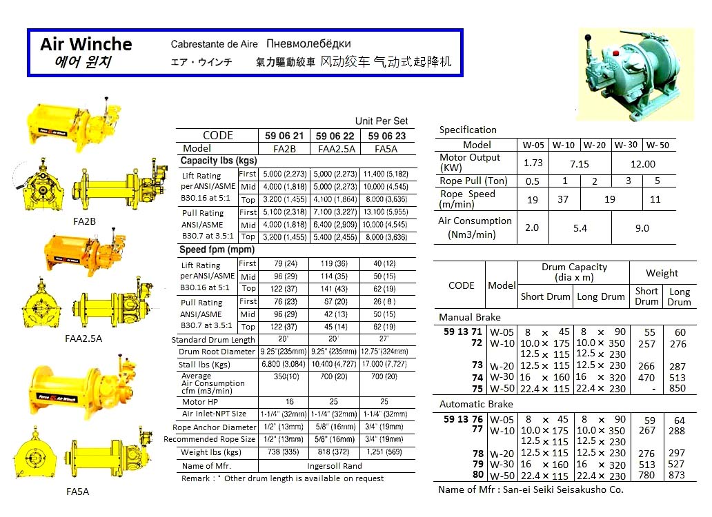 AIR WINCH, AUTOMATIC BRAKE, 7.15 KW, 2 TON, W-20, SANEI SEIKI, – SET