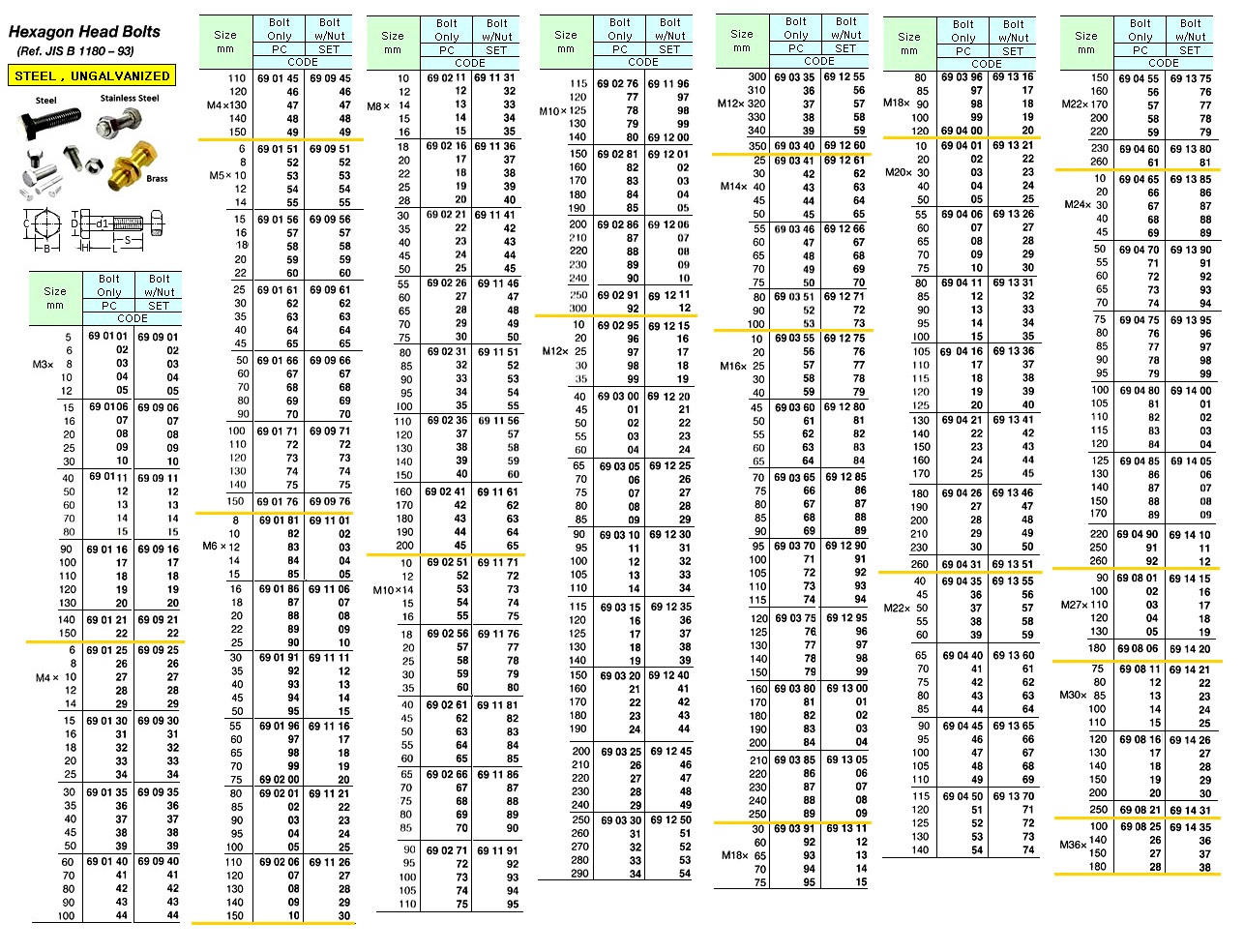 HEX. HEAD BOLT ONLY, STEEL, UN-GALV. M16 x 190 MM – PC